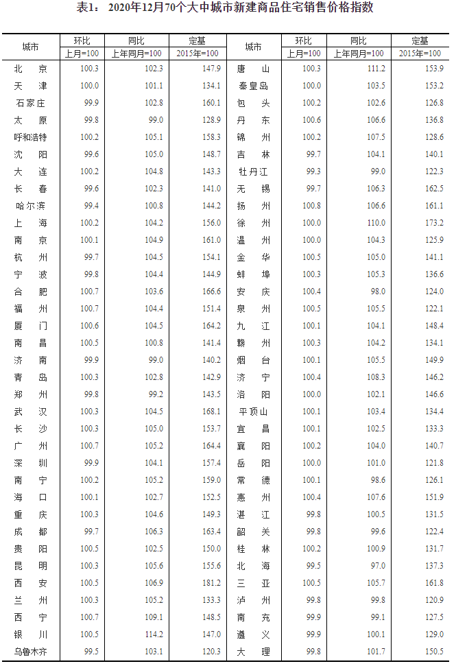 经济日报-中国经济网北京1月15日讯 国家统计局今日发布2020年12月份70个大中城市商品住宅销售价格变动情况,国家统计局城市司首席统计师绳国庆解读称,2020年12月份,70个大中城市房地产市场价格稳中略涨。